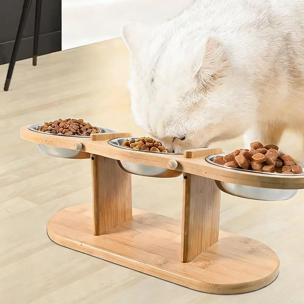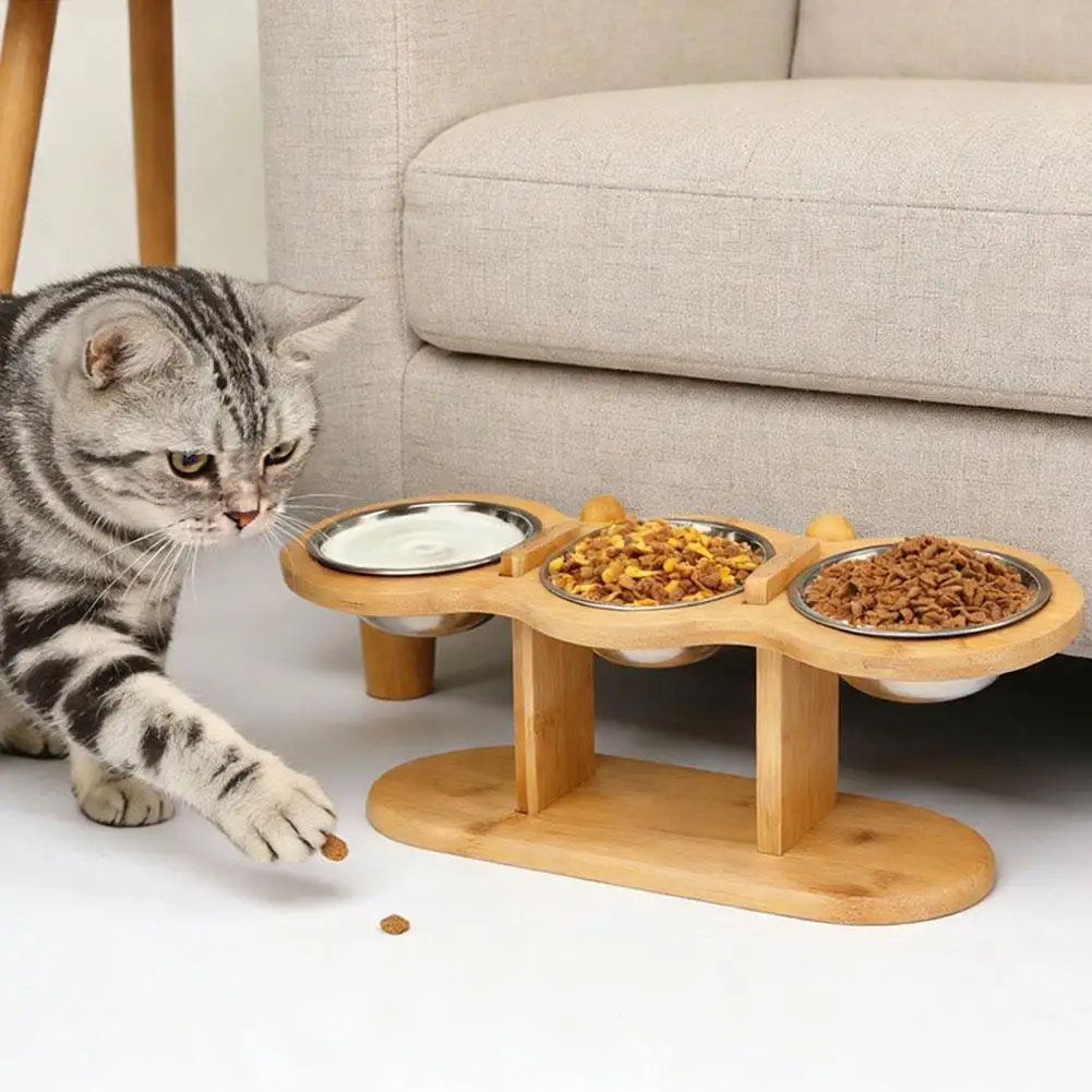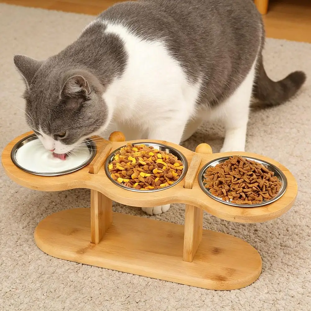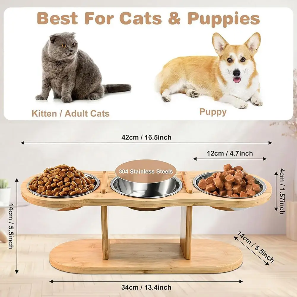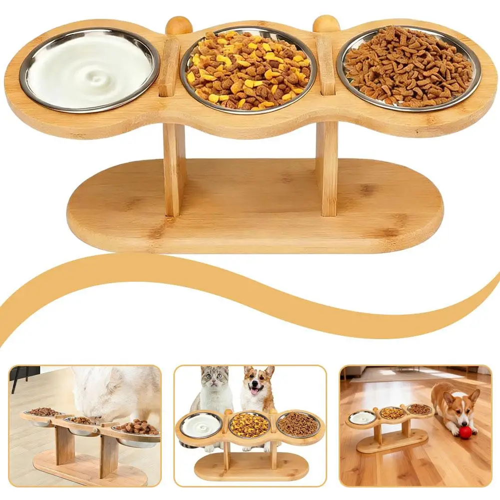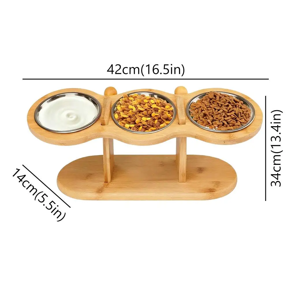 Bamboo Elevated Pet Feeder with 3 Stainless Steel Bowls for Cats and Dogs Non Slip Food and Water Bowl Stand