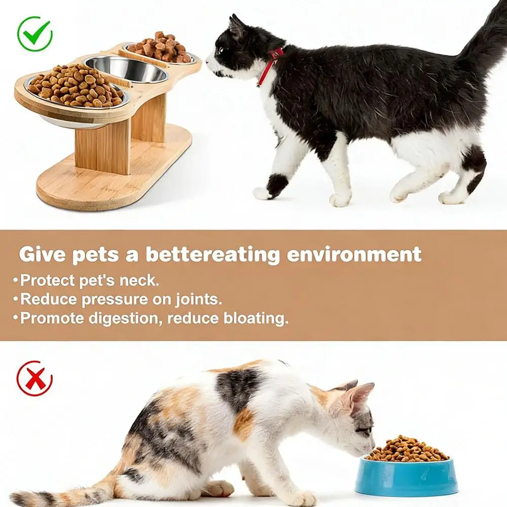 5. Convenient and Hygienic Design: The 304 stainless steel bowls are easy to clean (dishwasher safe), and the wooden frame is easy to wipe clean. The three-bowl design can hold water, dry food, and wet food simultaneously, meeting all your pet’s feeding needs.