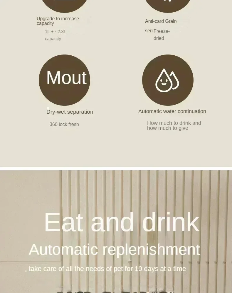 The design of the cat feeder is innovative: the water dispenser adopts a spiral spring valve design to ensure no leakage. Use transparent storage bottles to replenish food and water in a timely manner after use
