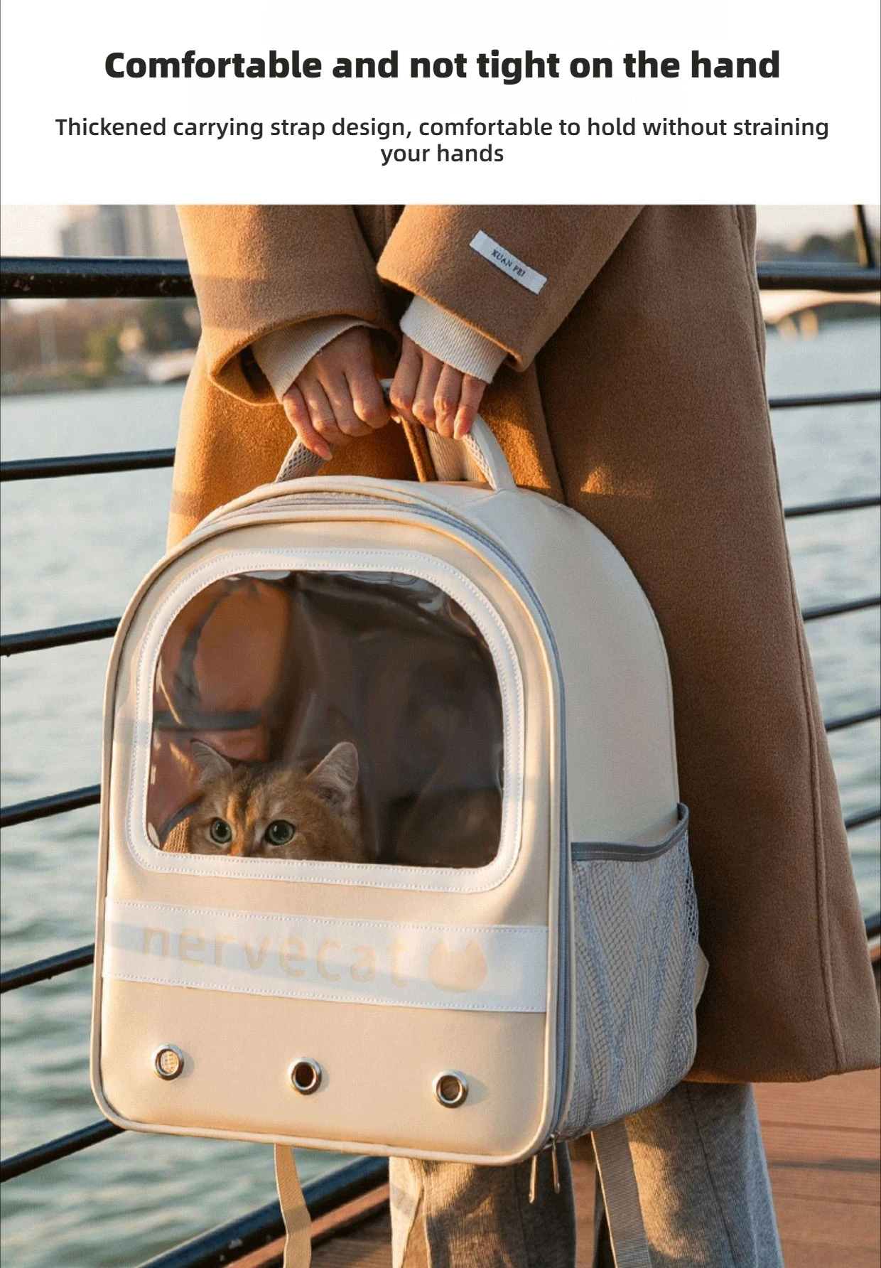 | Comfortable & Non-Digging Handles This backpack features thoughtfully designed padded handles made from soft, pressure-relieving material that effectively distributes weight across your palm. Whether carrying briefly or for longer periods, it provides a stable and comfortable grip that prevents digging or discomfort—making every trip with your cat truly effortless. |