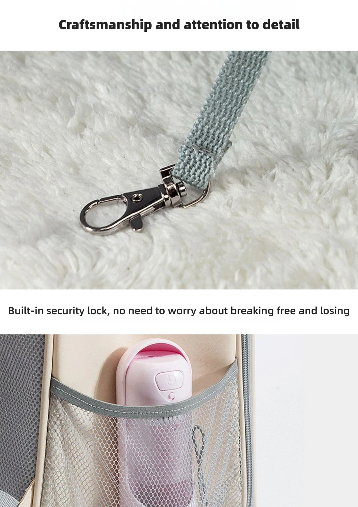 | Safety Features Designed with dual security: an anti-escape buckle on the main compartment and a safety latch on the side entry. Hidden zipper guards prevent scratching and biting, and the top handle includes a clever lead hook attachment. Multiple protective features give you complete peace of mind during outings. |