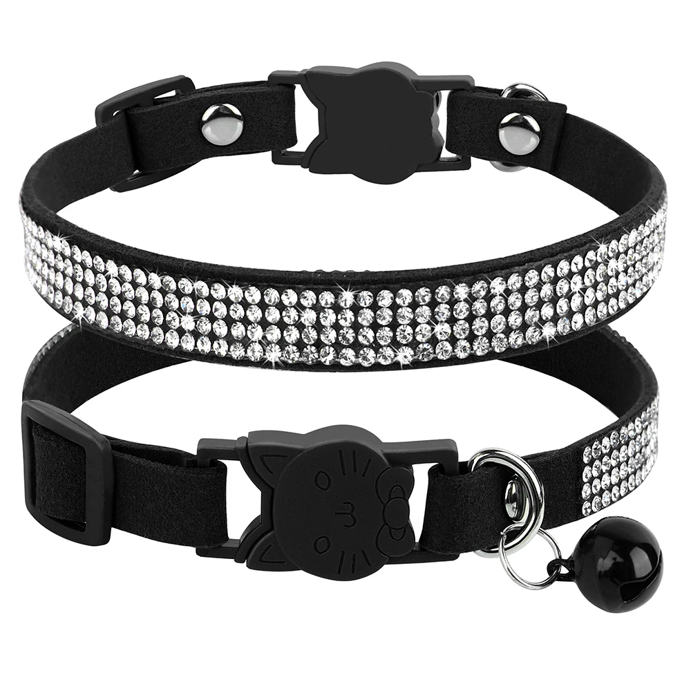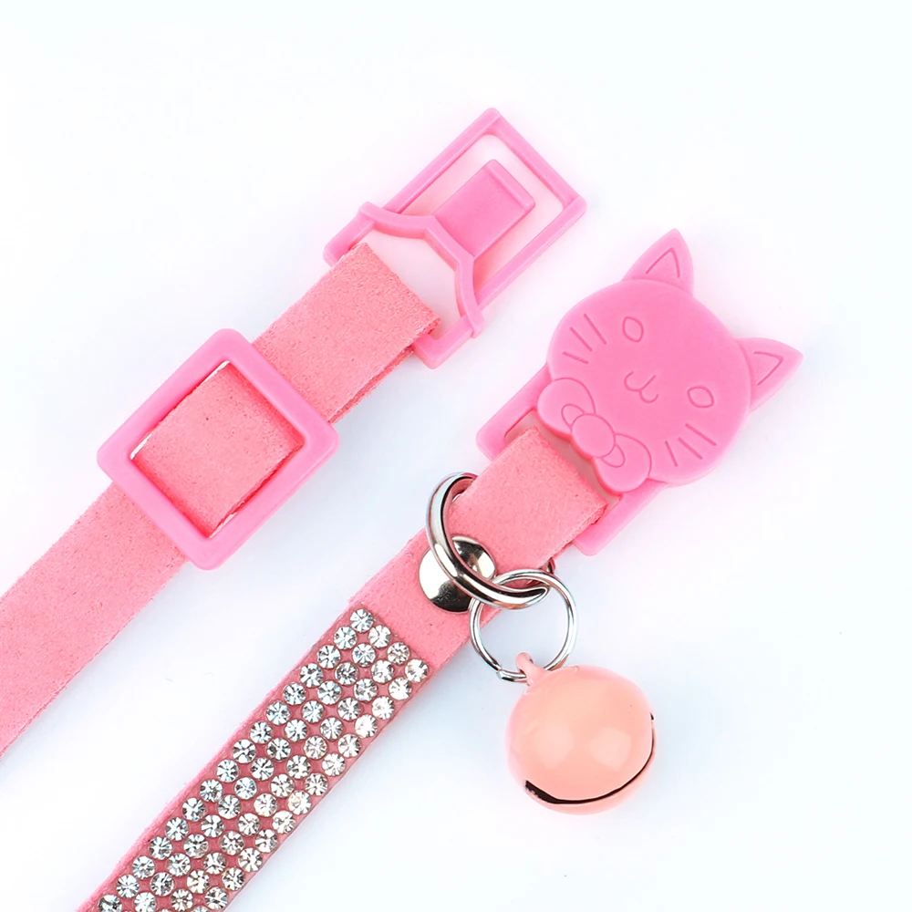 Soft Pink Suede Leather Cat Collar – Bling Rhinestone Design, with Bell & Safety Breakaway Buckle, Adjustable XS/S Sizes